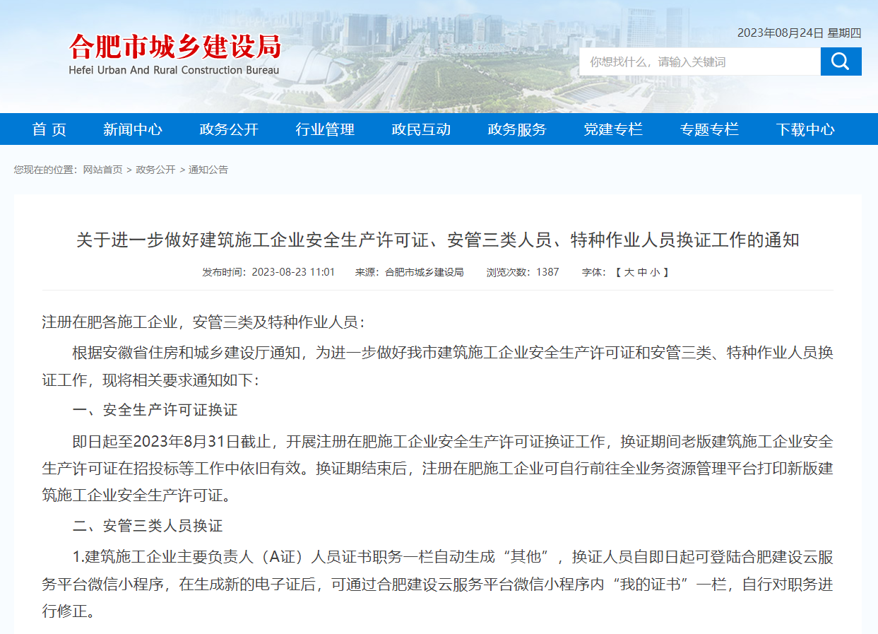即日起至2023年8月31日截止,開展注冊(cè)在肥施工企業(yè)安全生產(chǎn)許可證換證工作,換證期間老版建筑施工企業(yè)安全生產(chǎn)許可證在招投標(biāo)等工作中依舊有效。換證期結(jié)束后,注冊(cè)在肥施工企業(yè)可自行前往全業(yè)務(wù)資源管理平臺(tái)打印新版建筑施工企業(yè)安全生產(chǎn)許可證。