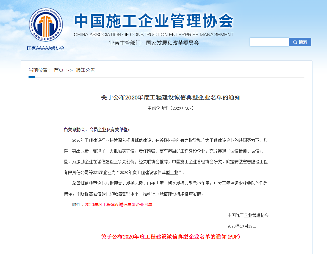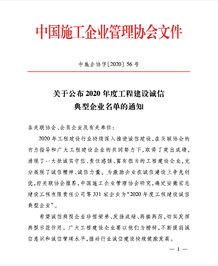 該榮譽(yù)是中國(guó)施工企業(yè)管理協(xié)會(huì)為深入誠(chéng)信建設(shè),在工程建設(shè)企業(yè)領(lǐng)域內(nèi)樹立一大批誠(chéng)實(shí)守信、責(zé)任感強(qiáng)、富有擔(dān)當(dāng)?shù)墓こ探ㄔO(shè)企業(yè),充分展現(xiàn)誠(chéng)信精神,誠(chéng)信力量,進(jìn)一步激勵(lì)企業(yè)在誠(chéng)信建設(shè)上爭(zhēng)先創(chuàng)優(yōu)。據(jù)悉,本次在全國(guó)范圍內(nèi)共評(píng)定331家企業(yè)為“2020年度工程建設(shè)誠(chéng)信典型企業(yè)”。