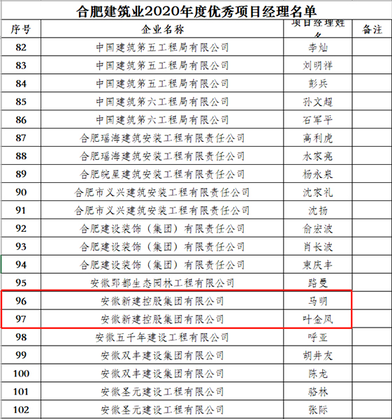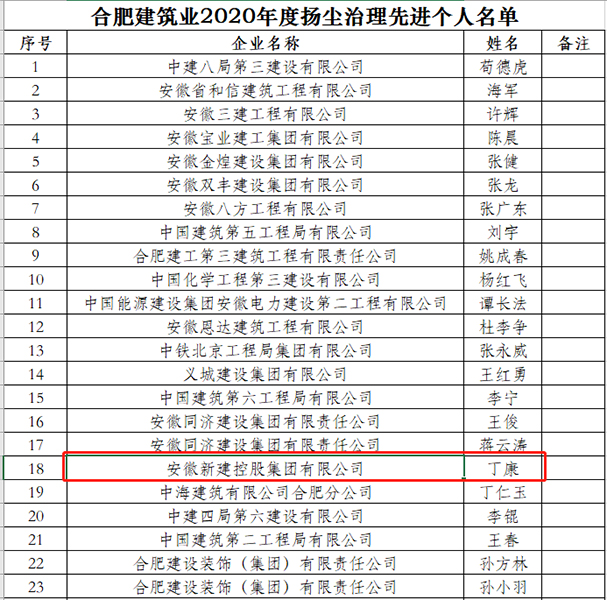 近日,合肥市建筑工程協(xié)會發(fā)布通知,合肥建筑業(yè)2020年度評優(yōu)評先工作已全面完成,獲獎單位頒發(fā)領(lǐng)取榮譽證書。安徽新建控股集團(tuán)公司榮獲合肥建筑業(yè)2020年度質(zhì)量管理先進(jìn)企業(yè)、合肥建筑業(yè)2020年度優(yōu)秀施工企業(yè)等2項榮譽。同時,集團(tuán)公司馬明、葉金鳳也被授予合肥建筑業(yè)2020年度優(yōu)秀項目經(jīng)理,丁康被授予合肥建筑業(yè)2020年度揚塵治理先進(jìn)個人。