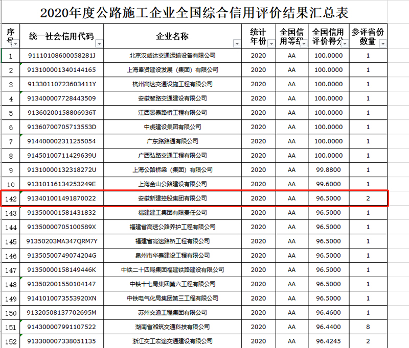 全國綜合信用評價(jià)內(nèi)容包括綜合素質(zhì)、財(cái)務(wù)狀況、管理水平、市場行為和信用記錄五大項(xiàng)內(nèi)容,涵蓋企業(yè)資質(zhì)、經(jīng)營規(guī)模、人力資源、管理者素質(zhì)等近50項(xiàng)指標(biāo)。此次參評2020年度全國綜合信用評價(jià)的公路施工企業(yè)共982家,其中獲得AA級的單位380家,安徽新建控股集團(tuán)有限公司認(rèn)真申報(bào)參評,最終不負(fù)眾望,再次榮獲公路施工企業(yè)全國綜合AA級信用評價(jià)。