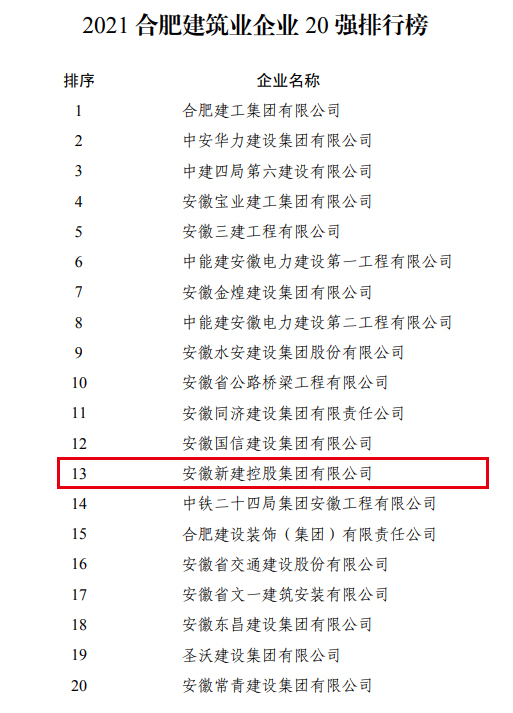 會(huì)上發(fā)布了2021合肥企業(yè)50強(qiáng)、2021合肥制造業(yè)企業(yè)30強(qiáng)、2021合肥服務(wù)業(yè)企業(yè)20強(qiáng)、2021合肥建筑業(yè)企業(yè)20強(qiáng)以及2021合肥農(nóng)業(yè)企業(yè)20強(qiáng)榜單。安徽新建控股集團(tuán)位居2021合肥建筑業(yè)企業(yè)20強(qiáng)第13位。
