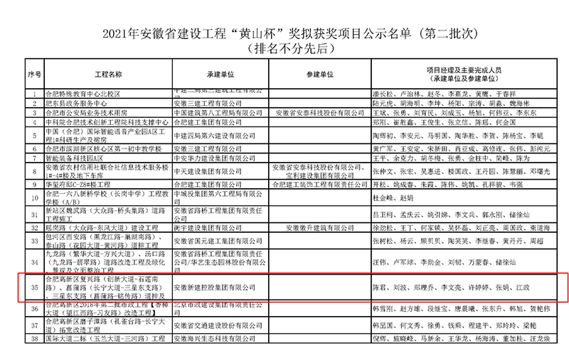 11月17日,安徽省住房和城鄉(xiāng)建設(shè)廳發(fā)布2021年安徽省建設(shè)工程"黃山杯"獲獎(jiǎng)項(xiàng)目名單。安徽新建控股集團(tuán)承建的合肥高新區(qū)復(fù)興路(創(chuàng)新大道——石蓮南路)、菖蒲路(長(zhǎng)寧大道——三星東支路)、三星東支路(菖蒲路——銘傳路)道排及附屬工程項(xiàng)目榜上有名。