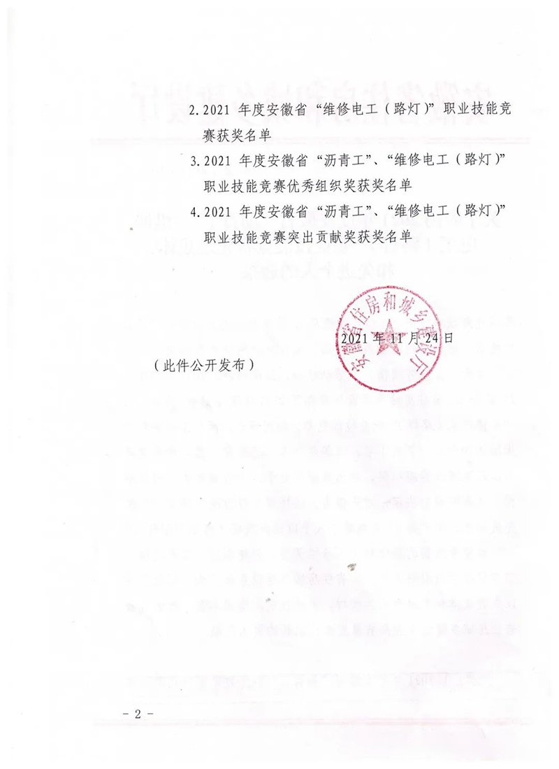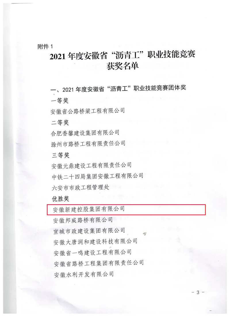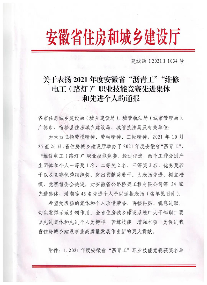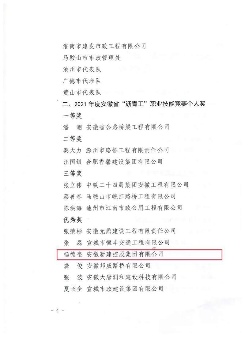 日前,安徽省住房和城鄉(xiāng)建設(shè)廳印發(fā)《關(guān)于表揚(yáng)2021年度安徽省“瀝青工”、“維修電工(路燈)”職業(yè)技能競(jìng)賽先進(jìn)集體和先進(jìn)個(gè)人的通報(bào)》,集團(tuán)公司參賽隊(duì)榮獲2021年度安徽省“瀝青工”職業(yè)技能競(jìng)賽團(tuán)體優(yōu)勝獎(jiǎng),隊(duì)員楊德奎獲得競(jìng)賽個(gè)人優(yōu)秀獎(jiǎng)。