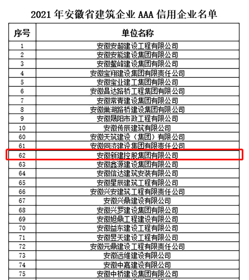 1月5日,安徽省建筑業(yè)協(xié)會分別公布了2021年安徽省建筑企業(yè)誠信典型企業(yè)、AAA信用企業(yè)評價結果,安徽新建控股集團憑借卓越的服務質量、品牌認知度和良好的社會信譽獲評“安徽省建筑企業(yè)誠信典型企業(yè)”和“AAA信用企業(yè)”兩項殊榮。