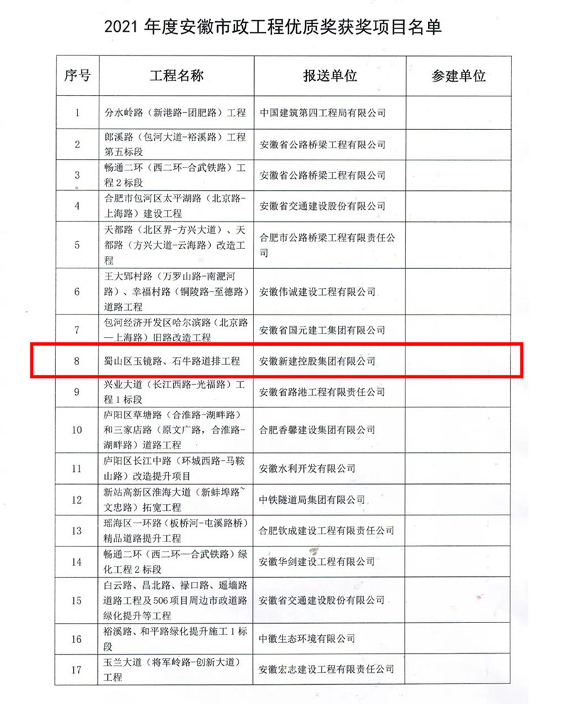 2022年1月17日,安徽省市政工程協(xié)會(huì)公布了2021年度安徽省市政工程優(yōu)質(zhì)獎(jiǎng)評(píng)選結(jié)果的通知,經(jīng)形式審查、現(xiàn)場(chǎng)復(fù)核、協(xié)會(huì)專家評(píng)審委員會(huì)審定,并公示無(wú)異議,安徽新建控股集團(tuán)有限公司承建的四項(xiàng)工程榮獲“2020年度安徽省市政工程優(yōu)質(zhì)獎(jiǎng)”!