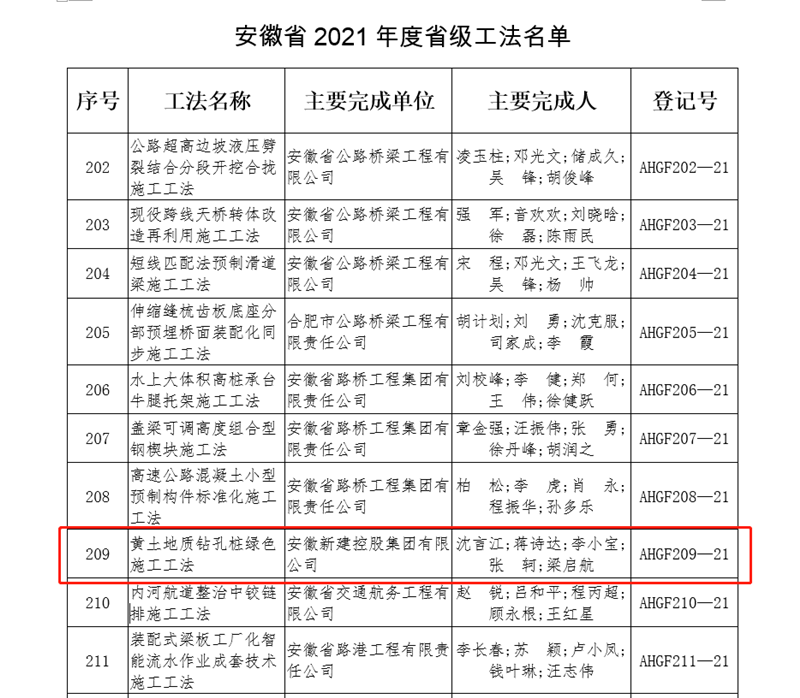 3月18日,安徽省住房和城鄉(xiāng)建設(shè)廳發(fā)布公告,按照《安徽省工程建設(shè)工法管理辦法》,經(jīng)省級(jí)工法評(píng)審委員會(huì)審定,新建集團(tuán)申報(bào)的一項(xiàng)“黃土地質(zhì)鉆孔樁綠色施工工法AHGF209—21”成功獲得安徽省2021年度省級(jí)工法認(rèn)證。