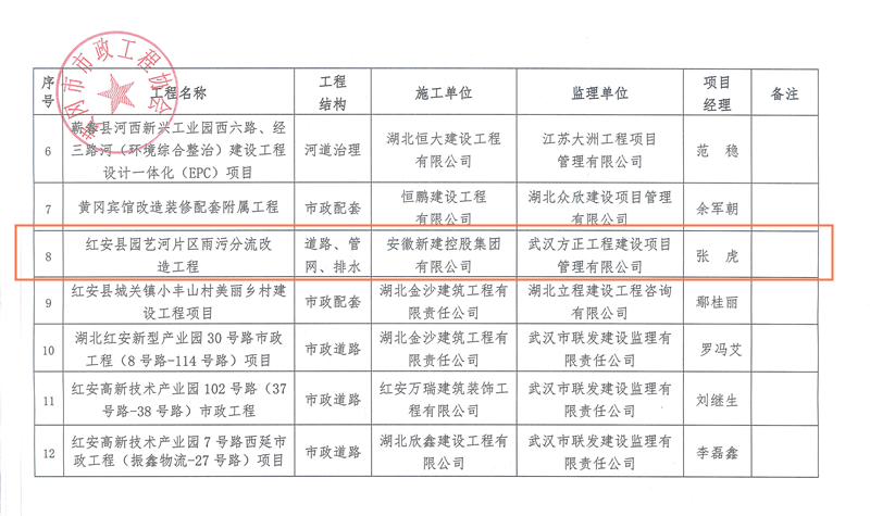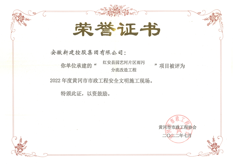 近日,由黃岡市市政工程協(xié)會主辦的“安全文明施工現(xiàn)場”評選結(jié)果出爐,公司承建的湖北省紅安縣園藝河片區(qū)雨污分流改造工程獲評“2022年度黃岡市市政工程安全文明施工現(xiàn)場”榮譽。