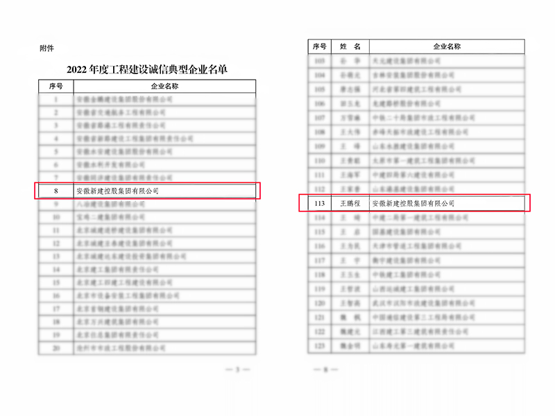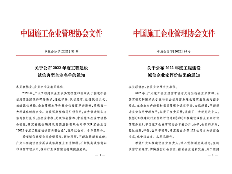 近日,中國施工管理協(xié)會發(fā)布了《關(guān)于公布2022年度工程建設(shè)誠信典型企業(yè)名單的通知》和《關(guān)于公布2022年度工程建設(shè)誠信企業(yè)家評價(jià)結(jié)果的通知》,安徽新建控股集團(tuán)有限公司榮獲“2022年度工程建設(shè)誠信典型企業(yè)”,總經(jīng)理王鵬程榮獲“2022年度工程建設(shè)誠信企業(yè)家”榮譽(yù)。