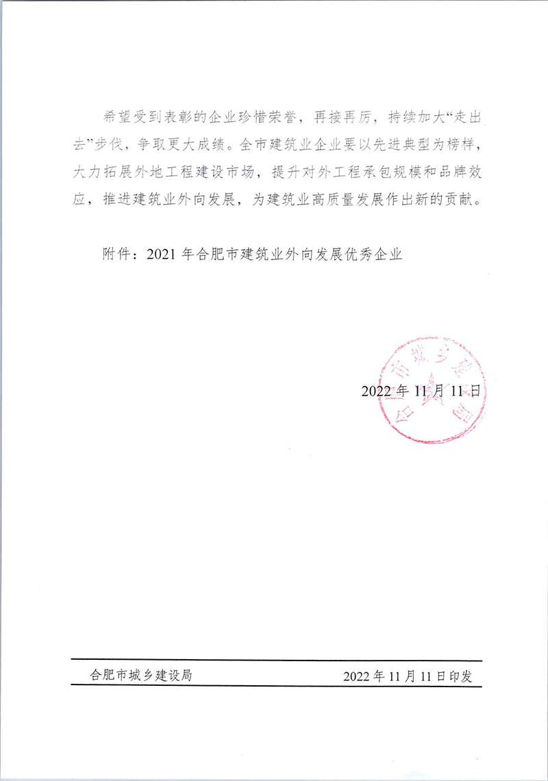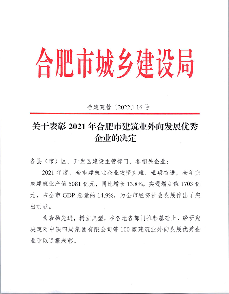 近日,合肥市城鄉(xiāng)建設(shè)局官網(wǎng)通報(bào)“2021年度合肥市建筑業(yè)龍頭企業(yè)50強(qiáng)”名單,并發(fā)文表彰“2021年合肥市建筑業(yè)外向發(fā)展優(yōu)秀企業(yè)”,安徽新建再次獲評(píng)2021年合肥市建筑業(yè)外向發(fā)展優(yōu)秀企業(yè),并榮登合肥市建筑業(yè)龍頭企業(yè)50強(qiáng)榜單。