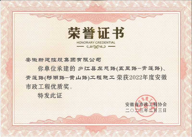 日前,安徽省市政工程協(xié)會(huì)頒發(fā)了2022年度安徽市政工程優(yōu)質(zhì)獎(jiǎng)獲獎(jiǎng)項(xiàng)目榮譽(yù)證書(shū),集團(tuán)公司承建的廬江縣左慈路青蓮路工程、全椒縣城人居環(huán)境提升工程兩項(xiàng)項(xiàng)目均獲市政工程優(yōu)質(zhì)獎(jiǎng)。