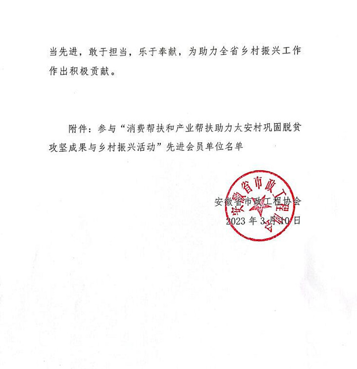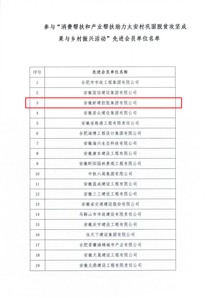 近日,安徽省市政工程協(xié)會(huì)發(fā)布關(guān)于表彰參與“消費(fèi)幫扶和產(chǎn)業(yè)幫扶助力太安村鞏固脫貧攻堅(jiān)成果與鄉(xiāng)村振興活動(dòng)”先進(jìn)會(huì)員單位的通報(bào)。表彰安徽新建控股集團(tuán)在內(nèi)的三百家企業(yè),積極參與了太安村鞏固脫貧攻堅(jiān)成果與鄉(xiāng)村振興活動(dòng),以實(shí)際行動(dòng)履行社會(huì)責(zé)任。