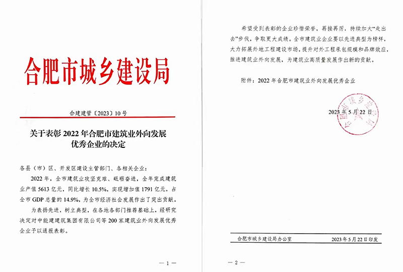 為表?yè)P(yáng)先進(jìn),樹(shù)立典型,5月22日,合肥市城鄉(xiāng)建設(shè)局發(fā)布《關(guān)于表彰2022年合肥市建筑業(yè)外向發(fā)展優(yōu)秀企業(yè)的決定》。安徽新建獲得“2022年合肥市建筑業(yè)外向發(fā)展優(yōu)秀企業(yè)”稱(chēng)號(hào)。