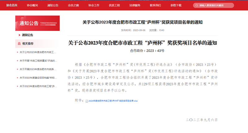 9月6日,合肥市市政工程協(xié)會官網(wǎng)發(fā)布了《關于公布2023年度合肥市政工程“廬州杯”獎獲獎項目名單的通知》,安徽新建控股集團承建、參建的四個項目榮獲2023年度合肥市市政工程“廬州杯”獎。