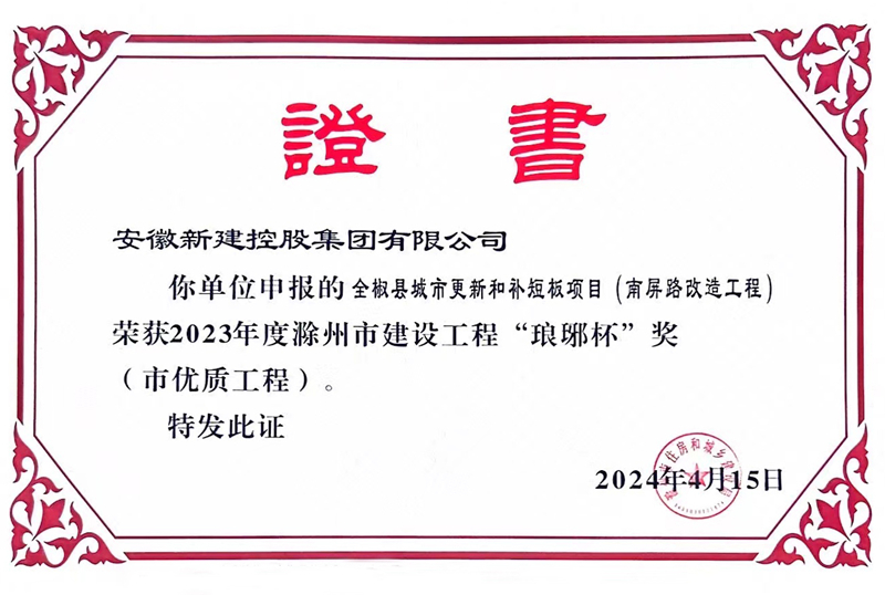 近日,集團公司收到由安徽省滁州市住房和城鄉(xiāng)建設局頒發(fā)的證書,公司承建的全椒縣城市更新和補短板項目(南屏路改造工程)榮獲2023年度滁州市建設工程“瑯琊杯”獎(市優(yōu)質(zhì)工程)。