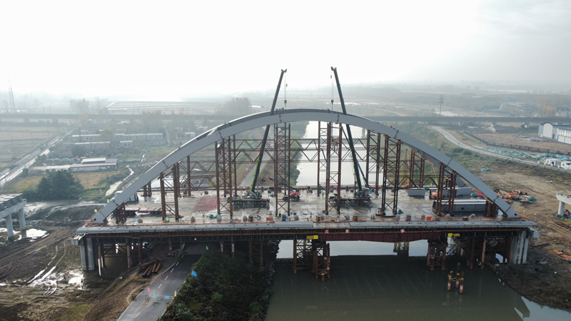 S239/S331來安至全椒段一級公路(全椒火車站至滁州大道段)工程路線起點為全椒縣火車站前萬福路與儒文路預(yù)留交口,路線自西向東,與規(guī)劃章陳路相交后,設(shè)橋跨襄河及防洪堤,終點與現(xiàn)狀滁州大道相交。該項目道路等級為一級公路兼城市主干道,標(biāo)準(zhǔn)段紅線寬度32米,路線總長約為2.445千米,均為新建。主橋采用單跨120米下承式鋼箱系桿拱橋結(jié)構(gòu),為梁拱組合體系橋梁,拱圈及縱梁均采用鋼箱結(jié)構(gòu)系桿為剛性系桿,全寬42米,橋面系采用正交異性鋼橋面板結(jié)構(gòu)形式。