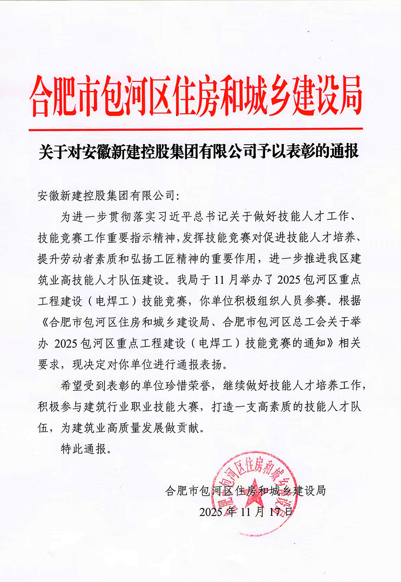 11月17日,從合肥市包河區(qū)住房和城鄉(xiāng)建設(shè)局傳來喜訊,我公司因在“2025包河區(qū)重點工程建設(shè)(電焊工)技能競賽”中的出色組織和積極參與,獲得主管部門通報表揚。這一榮譽是對我公司在技能人才培養(yǎng)和高素質(zhì)隊伍建設(shè)方面工作的充分肯定。