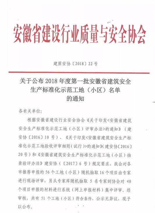 近日,安徽省建設(shè)行業(yè)質(zhì)量與安全協(xié)會公布了2018年度第一批安徽省建筑安全生產(chǎn)標(biāo)準(zhǔn)化示范工地(小區(qū))名單,由我公司承建的鳳亭路(魏武路-濛河路)項目榮登榜單!