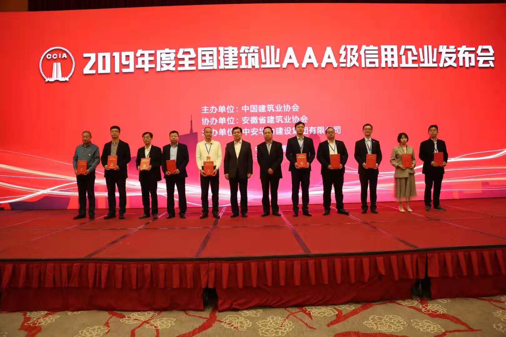 2019年10月31日,由中國建筑業(yè)協(xié)會主辦、安徽省建筑業(yè)協(xié)會協(xié)辦的2019年度全國建筑業(yè)AAA級信用企業(yè)發(fā)布會在合肥濱湖世紀(jì)金源大飯店圓滿召開,我公司憑借良好的企業(yè)信譽(yù)和優(yōu)質(zhì)的工程質(zhì)量,在諸多施工企業(yè)中脫穎而出,獲評"全國建筑業(yè)AAA級信用企業(yè)",并作為AAA級信用企業(yè)代表上臺領(lǐng)取證書。